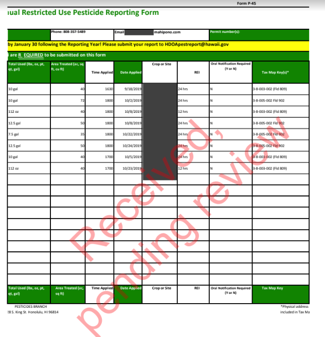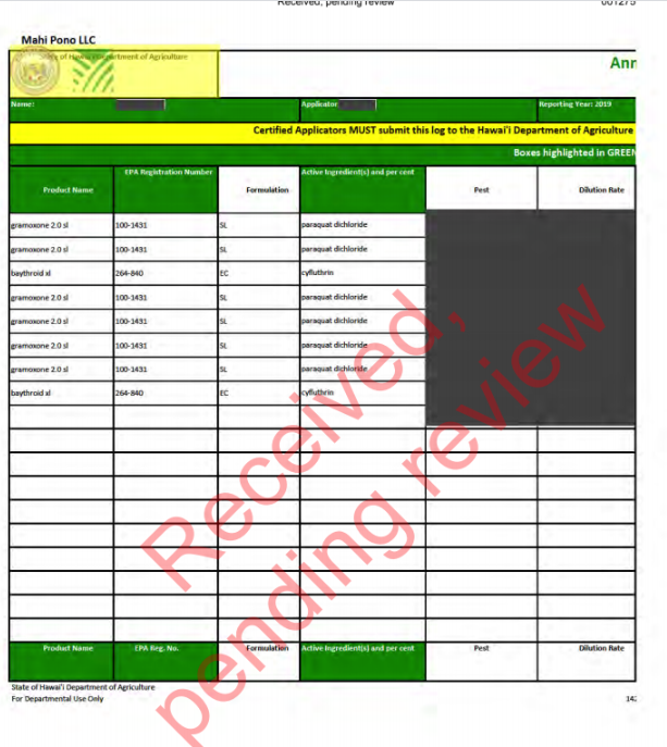 Mahi Pono’s 2019 Restricted Use Pesticide Report, filed with the state Department of Agriculture